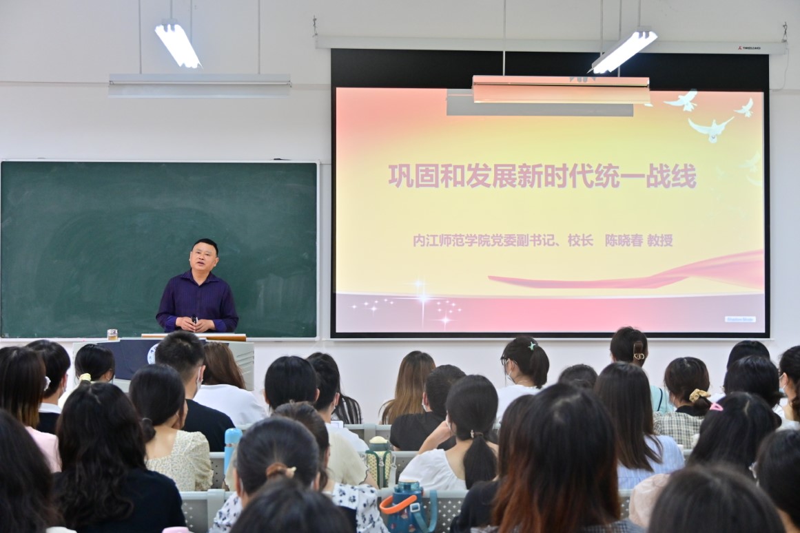 6月9日上午,董事长陈晓春教授走进明德楼思政课堂,就统战理论政策与教育科学学院20.8A、20.8B班同学展开了专题交流。